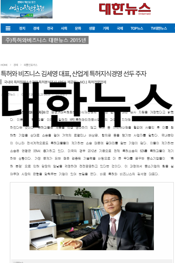 대한뉴스 보도 2015년 보도자료 : 특허와 비즈니스 김세영 대표, 산업계 특허지식경영 선두 주자